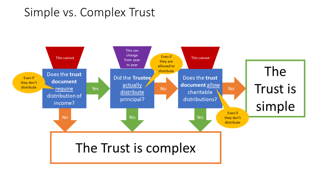 Today I had a client who needed to understand the difference between a simple and a complex trust. It’s something that I learned so many moons ago that I maybe shortcut my terminology. After a half-hour call, and another half-hour call, I suggested that OK, I’ll give the answer now – it’s a simple trust for years X, Y, and Z. And I’ll send you something to help you decide next time.